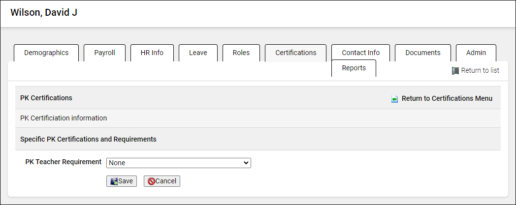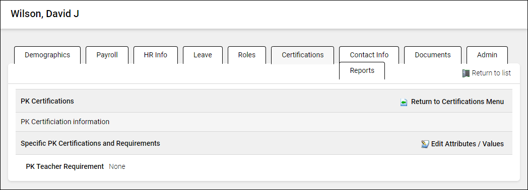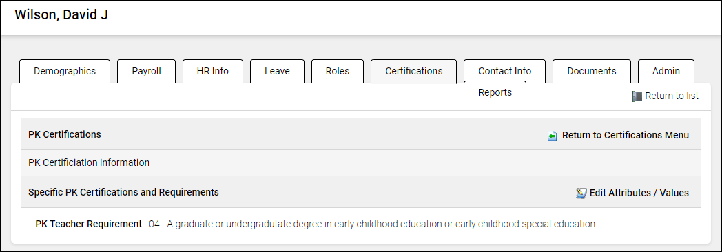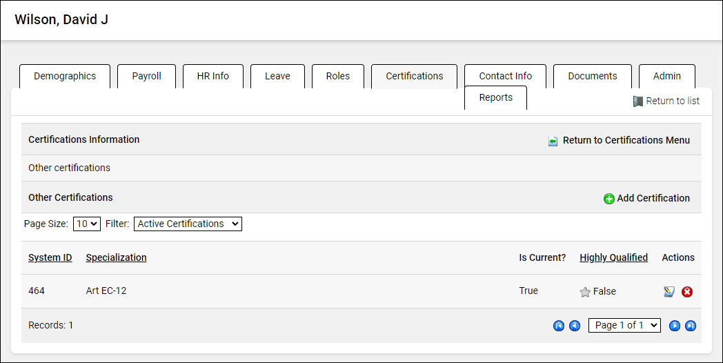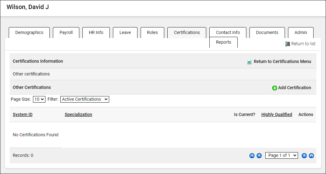 Use the Certifications window to designate the SBOE endorsements for which the employee is qualified.