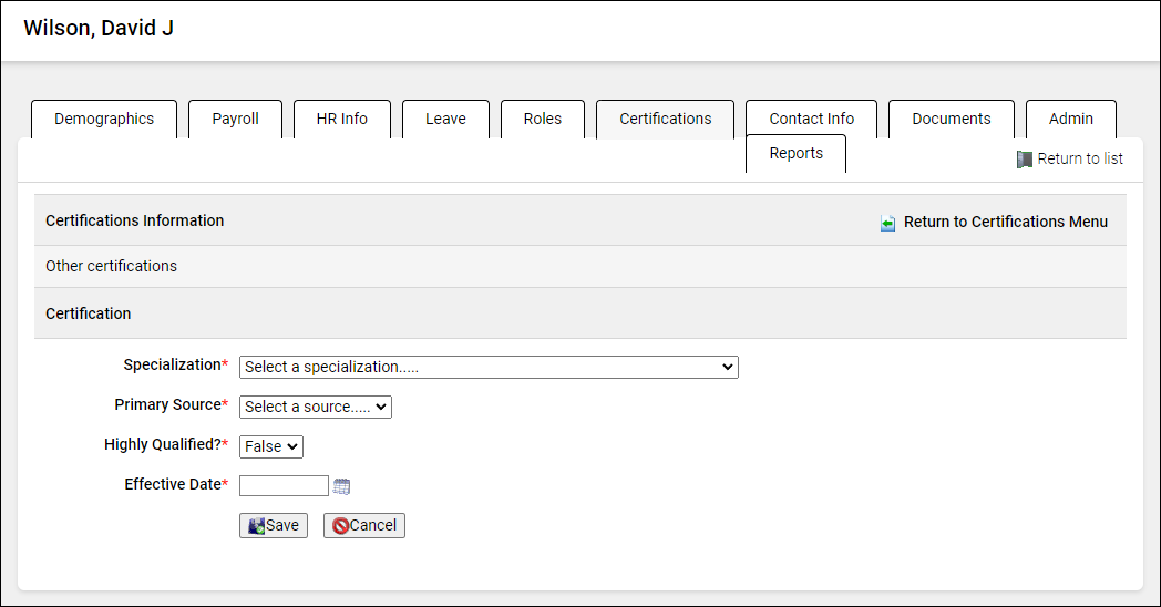Specialization: Enter the specialization from the employee's teaching certificate.