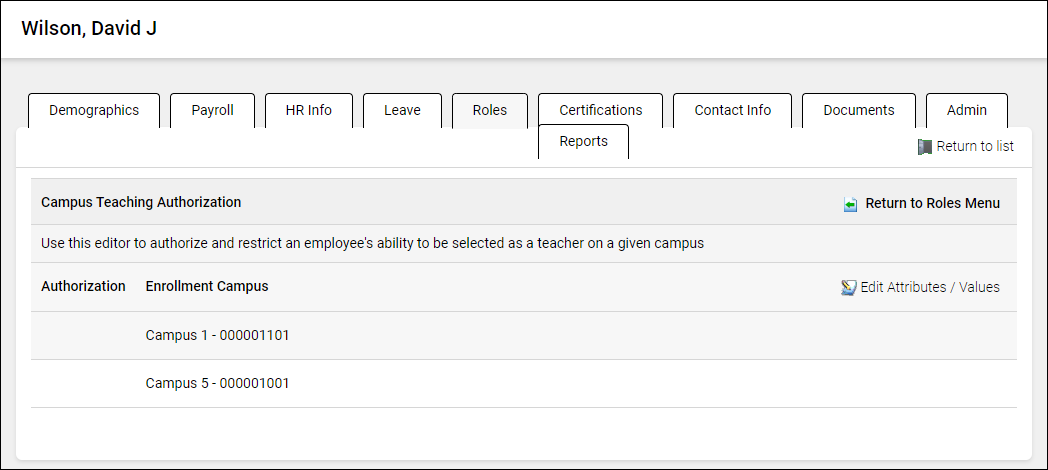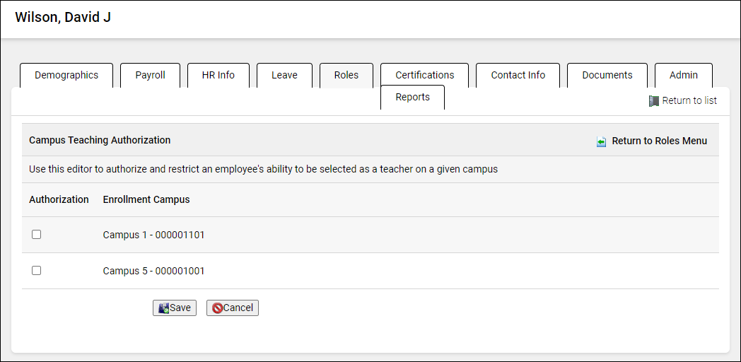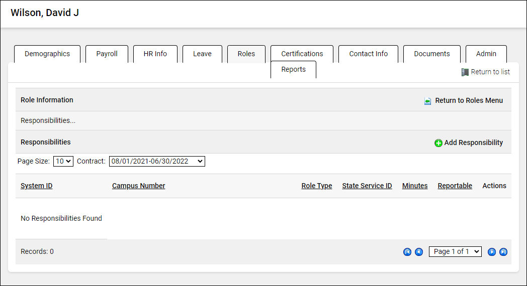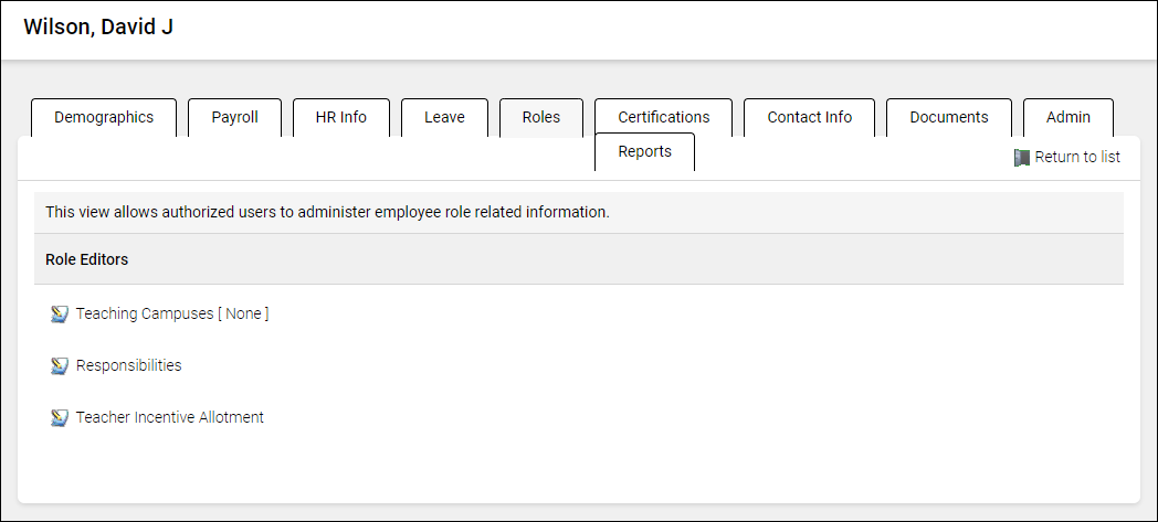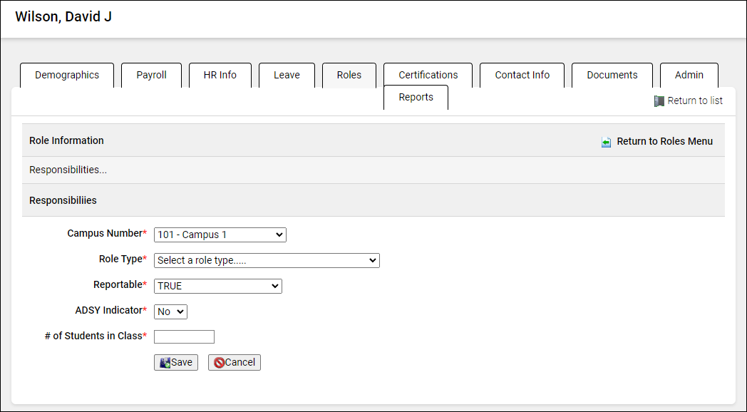 Use the Roles window to identify an employee's campus(es) and responsibilities for PEIMS reporting purposes and access to Gradebook.