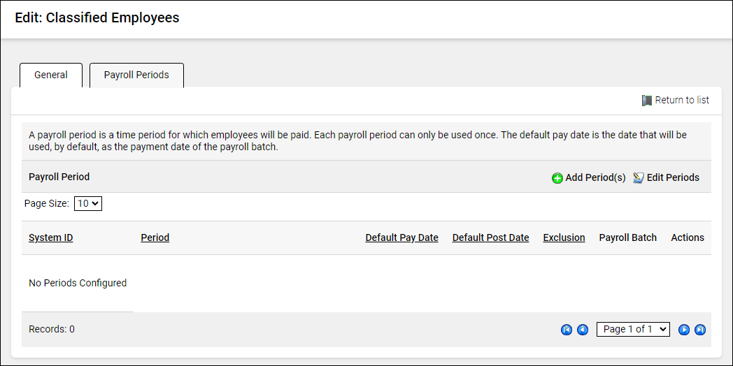 Click on the Payroll Periods tab, and that window opens displaying any existing payroll periods.