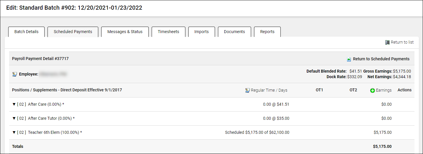 Positions/Supplements: This section displays the scheduled positions to be paid in this batch, along with the direct deposit/manual check setting. It's also where you'll add supplements, enter days worked for non-salary schedule positions and overtime hours where applicable.