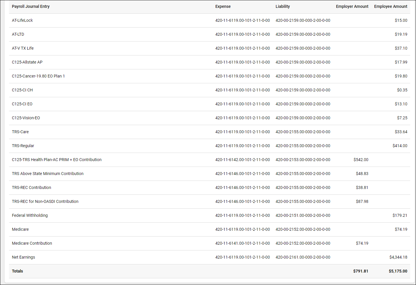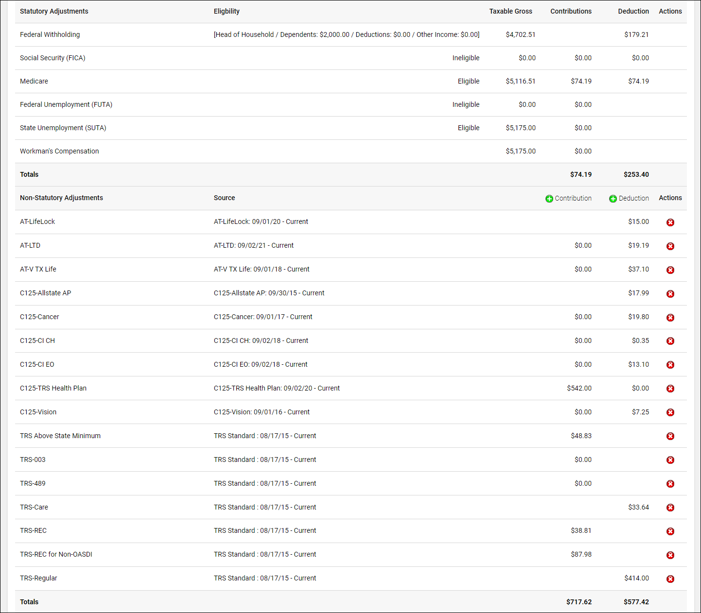 This section displays the employee's benefit elections with the amounts of contributions and deductions. It can be used to correct a benefit amount by adding a contribution or deduction with the correct amount and then deleting the benefit with the incorrect amount. The benefit will be correctly reported to TRS, but designated as manually added on the pay stub.